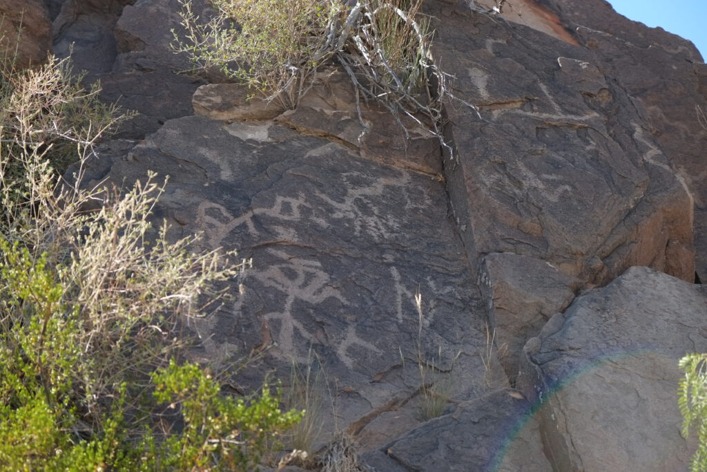 Am 6. Tag unserer Reise machen wir uns auf, um die Umgebung von Ciudad Juarez zu erkunden. Wir fahren Richtung Süden durch immer weniger besiedeltes Gebiet, zunächst noch auf der Autobahn, zuletzt über Sandpisten. Unser erster Stopp ist an einem Berg, bei dem petrograbados (Petroglyphe), in Stein geritzte Zeichnungen, gefunden wurden. Wir müssen ein kleines Stück laufen bzw. klettern, dann erkennen wir sie überall. Auf den Steinen sind einige Glyphen zu sehen, es sind außerdem Tiere zu erkennen, ein Stein scheint eine Art Landkarte zu zeigen.