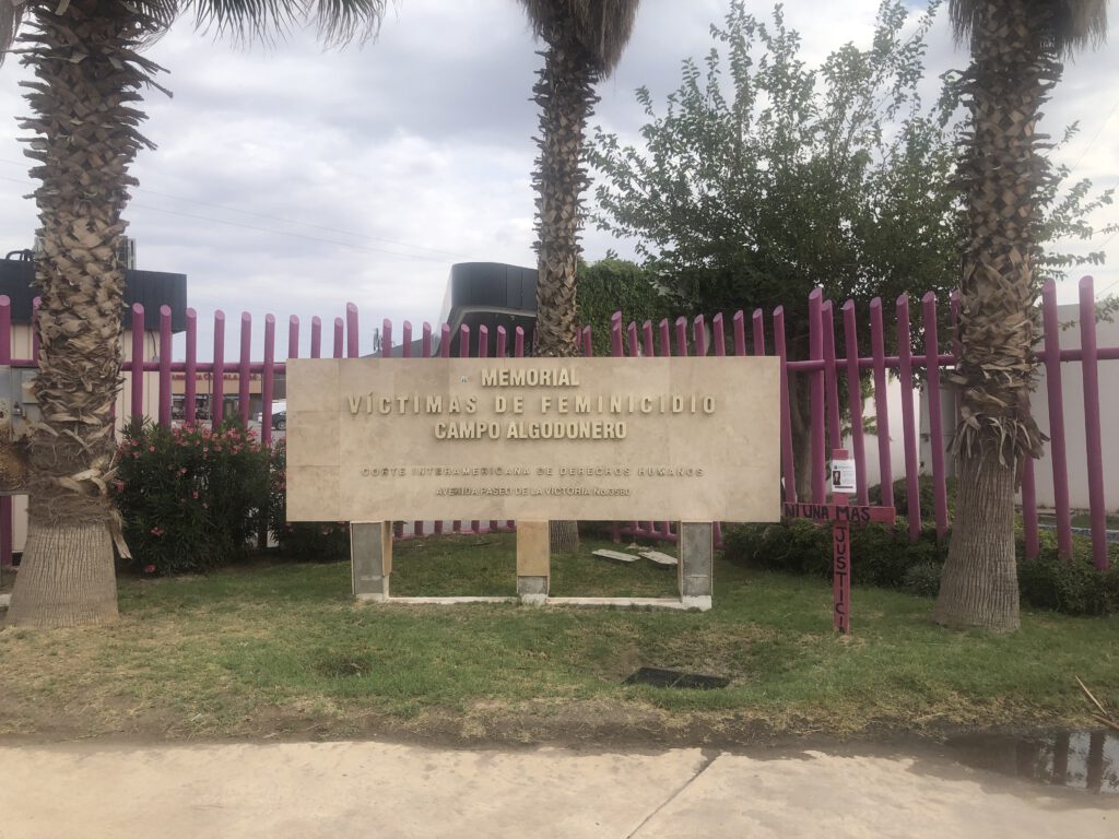 Es ist irritierend eine Gedenkstätte, die Feminizide thematisiert, so kalt gestaltet zu sehen. Einen Teil der Erklärung dafür findet man in der Entstehungsgeschichte: Mexiko wurde vom Interamerikanischen Gerichtshof für Menschenrechte dazu verurteilt, ein Denkmal zu errichten. Das Urteil von 2009 behandelt den Fall von drei jungen Frauen, deren Körper neben fünf weiteren auf dem Baumwollfeld gefunden wurden. Ungefähr dort, wo heute das Denkmal steht. Juristisch ist das Urteil wegweisend, da es zum ersten Mal zu einer Behandlung von Feminiziden auf internationaler Ebene kam und die staatliche (Mit-)verantwortung an den Morden klar benannt und verurteilt wurde. In der mexikanischen Realität steht es jedoch weiterhin nur exemplarisch für die erschreckend hohe Anzahl von Feminiziden in Juárez seit den 90er Jahren.