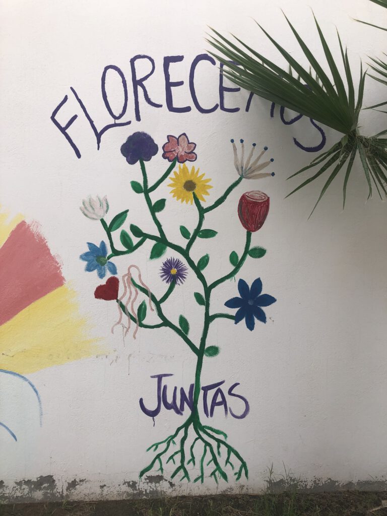 Doch zum Glück haben auch hier Aktivist*innen das Gedenken mitgestaltet. Sie haben ihrem Kampf um Anerkennung der Morde als Feminizide, ihrer Trauer und ihrem Widerstand Platz verschaffen. Auf den Rasenflächen stehen die bekannten pinken Kreuze mit der Aufschrift „Ni una más“ und die große Wand am Ende der Gedenkinstallation ist bemalt in Erinnerung an Isabel Cabanillas und andere durch patriarchale Gewalt Ermordeten. Blumen, bunte Farben und die Anklage staatlicher Verantwortung sind die Anteile des Gedenkortes, die einen betroffen machen, einen wütend werden lassen und einen darin bestärken weiter zu kämpfen – nicht nur in Mexiko, sondern auch bei uns.