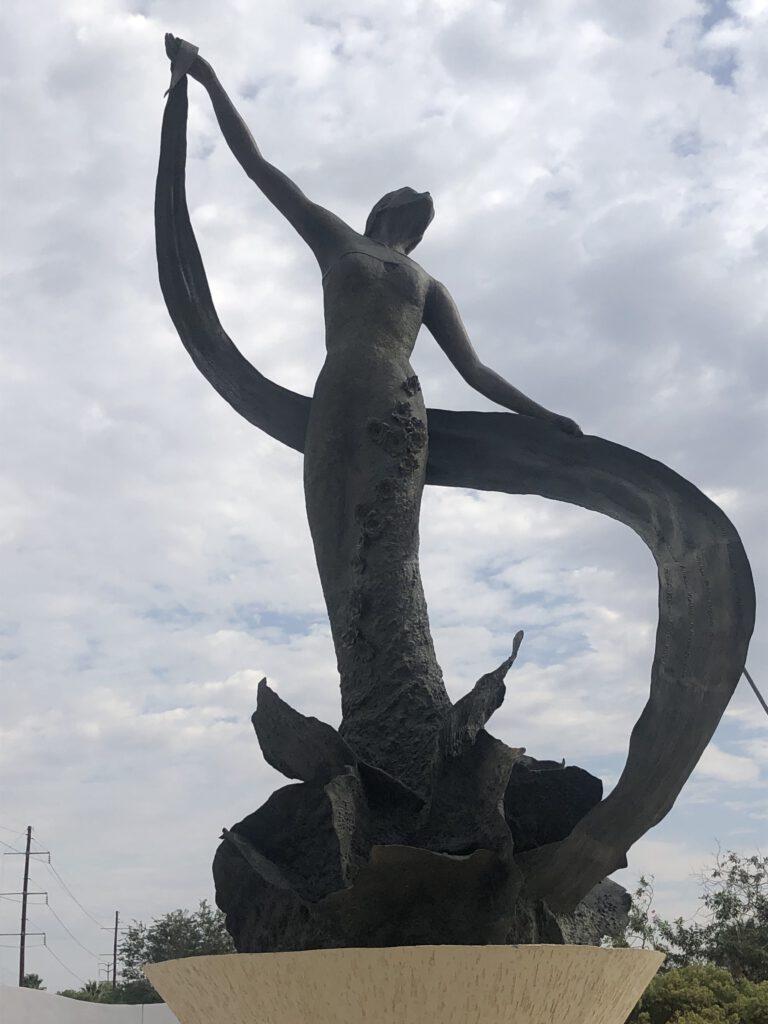 Durch ein Metalltor, betritt man das Denkmal. Es ähnelt mehr einer heruntergekommenen Gartenanlage: ummauert von nackten, beigen Steinwänden führt ein breit gepflasterter unter ein Metalldach, das wohl Schatten spenden soll, hin zu einer erhöhten Statue einer weiblichen Figur, die von Weitem betrachtet auch an jedem anderen Platz auf der Welt stehen könnte.